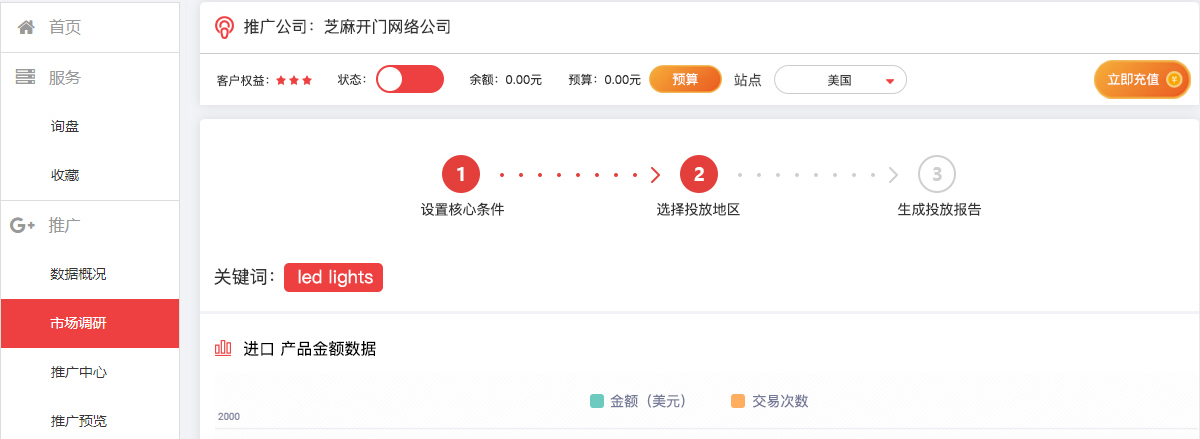 后臺(tái)直接充值即可進(jìn)行谷歌投放,內(nèi)置關(guān)鍵詞工具、推廣中心、推廣預(yù)覽、消費(fèi)明細(xì)等,直接操作,不需要再去進(jìn)行谷歌開戶等操作。